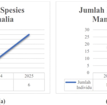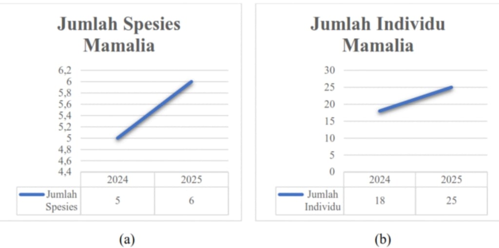 Pada 2025, jumlah individu mamalia meningkat dari 18 menjadi 25, dengan satu spesies baru Callosciurus nigrovittatus tercatat. Temuan berlokasi di area kaliandra dengan kanopi rapat, menandakan masih adanya kantong habitat arboreal yang mendukung mamalia meski sebagian besar area telah berubah menjadi habitat terbuka. Dari trendline tersebut dapat dikatakan bahwa tidak terdapat banyak perubahan dan kondisi keanekaragaman mamalia cenderung stabil.