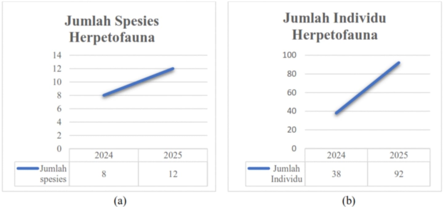 Pada 2025, herpetofauna yang teramati meningkat dari 8 spesies di tahun 2025 menjadi 12 spesies di tahun 2025. Seperti Amyda cartilaginea, Eutropis rugifera, Chalcorana chalconota, Cyrtodactylus semiadii, dan Draco volans yang ditemukan pada tahun 2025 sedangkan Malayophyton reticulatus tidak teramati di tahun yang sama. Kenaikan kekayaan dan kelimpahan ini mengindikasikan potensi perubahan nilai penting dan komposisi komunitas ke depan. Adanya perubahan nilai indeks ekologis atau nilai penting keanekaragaman spesies herpetofauna, dikarenakan adanya perubahan jumlah spesies dan individu yang teramati.