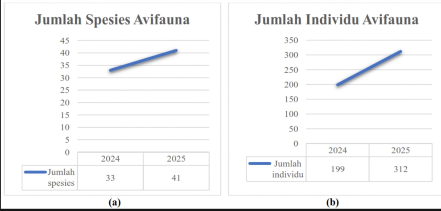 Pada 2025, teramati 11 spesies burung baru, termasuk raja udang meninting, raja-udang punggung-merah, kapinis rumah, bambangan kuning, kowak malam abu, sepah kecil, kepudang kuduk-hitam, caladi ulam, gemak loreng, perling kumbang, dan tepus-pipi perak.